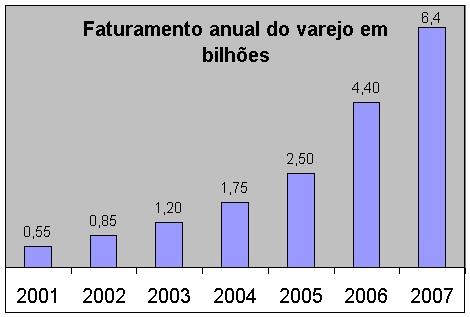 | Fonte: Levantamento realizado pela empresa e-Bit www.ebitempresa.com.br / Compilação: www.e-commerce.org.br Nota: não estão incluídos neste indicador o faturamento de sites de leilão, as vendas de passagens aéreas e vendas de automóveis. |